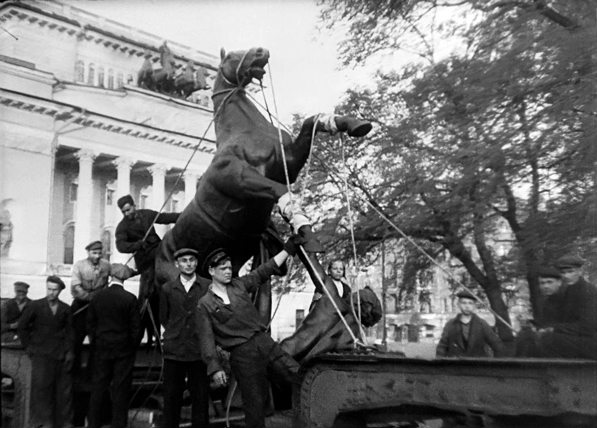 Ну а мы переносимся в Ленинград в год Победы! Кони Клодта, снятые в начале войны и спрятанные в запасники, чтобы не пострадать от бомбардировок возвращаются на свои привычные места на Аничковом мосту. Случилось это в ночь с 1 на 2 июня. А это воспитанники детского сада, который работал при Ленинградском политехническом институте на прогулке.