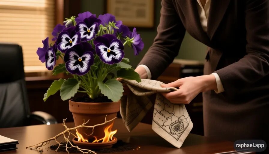 Женщина осторожно опустила горшок на стол, развернула платок, и в офисе детективов словно стало чуть светлее: внутри росла петуния — крупная, густая, с бархатными тёмно-фиолетовыми лепестками, на которых серебристыми прожилками проступал узор, напоминающий старинную каллиграфию или трещины на глазури древнего фарфора; листья её были плотные, мясистые, с лёгким перламутровым налётом, а у основания стебля, в почве, виднелись тонкие нити, похожие на корешки, но отливавшие слабым янтарным светом, словно под землёй тлели крошечные угли.