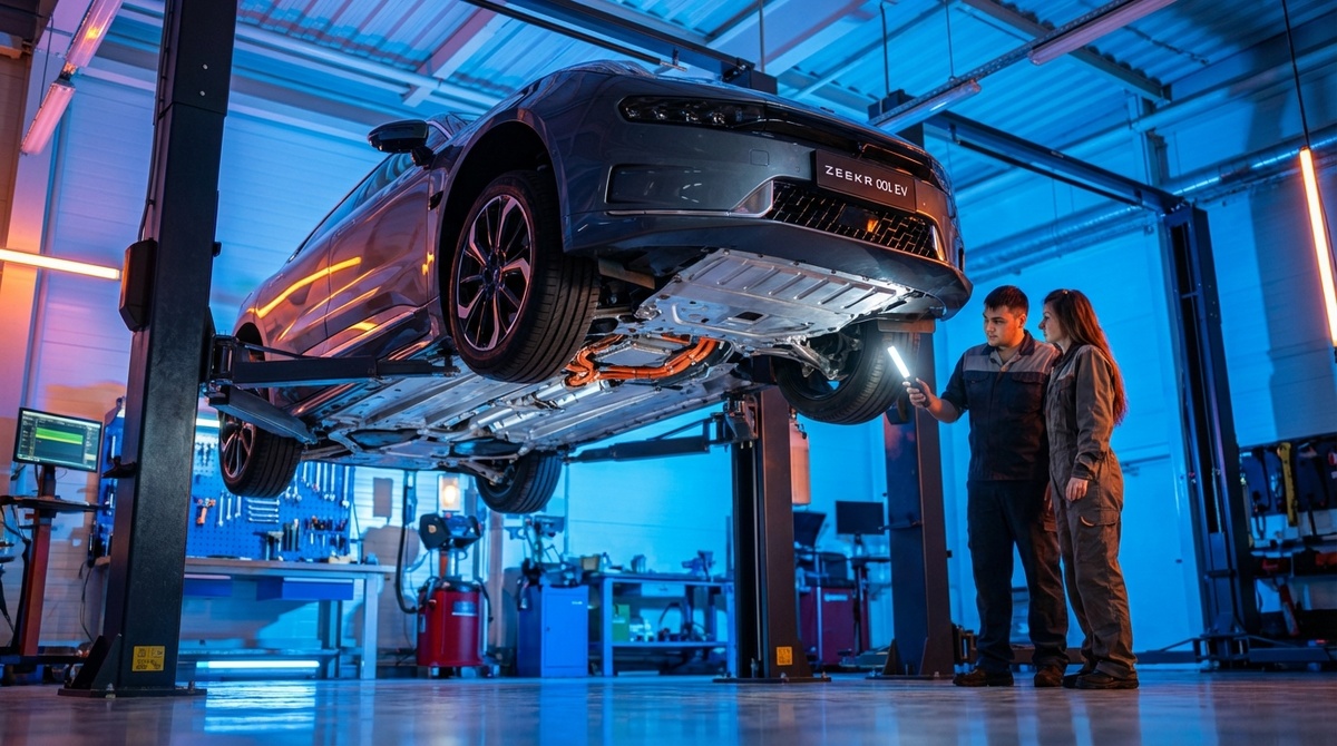 Итак, наш трехлетний Zeekr 001 плавно поднимается на двухстоечном подъемнике. Первое, что бросается в глаза, когда стоишь под машиной — это абсолютная, монолитная плоскость. Днище электромобиля зашито аэродинамическими щитками от переднего бампера до заднего диффузора. Нет никаких торчащих выхлопных труб, раскаленных катализаторов, свисающих карданов или бензобаков нестандартной формы. Аэродинамика — это запас хода, поэтому дно здесь ровное, как стол.