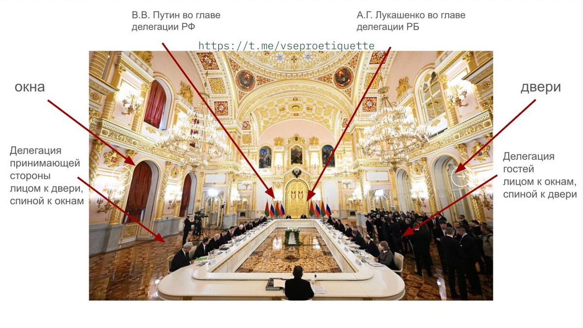 Хороший вопрос пришел от подписчицы: Подскажите, почему при недавней встрече Путина В.В. и Лукашенко А.Г., наш президент сел справа, хотя это место гостя? Как я писала здесь, такой вариант рассадки является не традиционным для международных встреч. В прежние времена (в СССР) ее практиковали чаще, сегодня в РФ почти отказались. Потому и Путин сначала перепутал и по привычке пошел занимать место посередине длинной части стола. Но раз уж решили, что это не переговоры, а совместное заседание, то, видимо, посадив руководителей «бок о бок», подчеркнули совместный характер их руководства. При таком протокольном решении, строго говоря, посадить глав делегаций по-другому (например, «гость» по правую руку от «хозяина») и не получилось бы. Почему? Объясняю на слайдах. Итак, протокол: В зале «пенал», где на одной стене двери, а на другой окна, гости садятся лицом к окнам, спиной к двери. Это правило и оно в данном случае соблюдено. При этом, президент должен возглавить свою делегацию, а зна