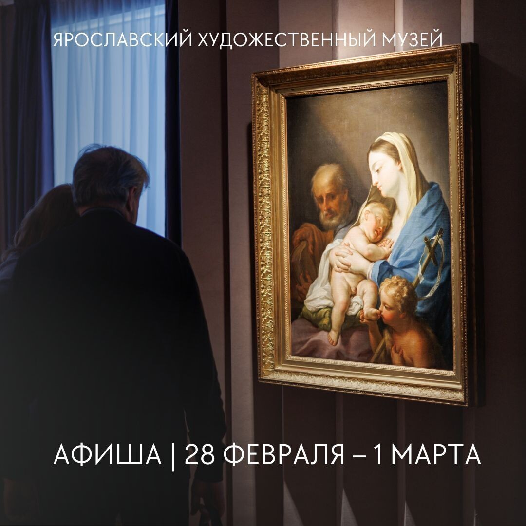 : 📍 Музей зарубежного искусства. Советская площадь, 2 28 февраля, 1 марта в 12:00 – сборная экскурсия по выставке «Итальянская живопись XVII–XIX веков в собрании князей Юсуповых» 📍Губернаторский дом. Волжская набережная, 23 28 февраля, 1 марта в 15:00 – сборная экскурсия по выставке «А море ждет нас» 28 февраля в 16:00 – музейный синематограф. Показ фильма «Иван Айвазовский» (2000) 📍Митрополичьи палаты. Волжская набережная, 1 28 февраля в 15:00 – лекция «Икона «”Воскресение – Сошествие во ад” – необычный памятник ярославской живописи XVIII века» 1 марта в 13:00– сборная экскурсия по экспозиции «Древнерусское искусство XIII–XVII веков» 📍Дом на Новинской. Тутаев, ул. Ленина, 59/8 28 февраля в 15:00 – сборная экскурсия по экспозиции Романово-Борисоглебского городского общественного банка
