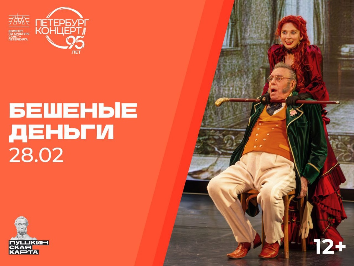 «Петербург-концерта»: 28.02 | СБ – оперетта "Прекрасная Галатея» | 12+ – комедия «Бешеные деньги» от театра «АРТ» | 12+ 01.03 | ВС – спектакль «Нервные люди» по рассказам Михаила Зощенко. Последний показ! | 12+ 03.03 | ВТ – романтическая комедия «Собачья жизнь» театра «АРТ» по пьесе Альберта Гёрни «Сильвия» | 16+ – вечер оперной музыки «Любовный напиток» | 6+ 04.03 | СР – Джазовая среда в Екатерининском собрании | 16+ 05.03 | ЧТ – шоу-программа «Мы из мюзикла» в исполнении артистов театра «АРТ» | 16+ – иммерсивный спектакль «Камелии для Травиаты» по мотивам знаменитой оперы Джузеппе Верди | 16+ 06.03 | ПТ – концерт «Популярная классика» | 6+ Все события, доступные по Пушкинской карте на месяцы вперед, можно найти на официальном сайте «Петербург-концерта» 💬 Мы в MAX