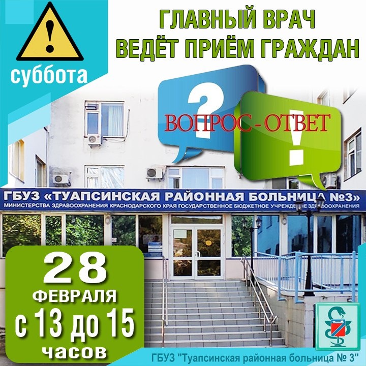 ⚠️ В субботу, 28 февраля с 13 до 15 часов, главный врач ГБУЗ "Туапсинская районная больница № 3" Игорь Александрович Папаценко проводит приём граждан по вопросам оказания медицинской помощи. ✅ Получить ответы на Ваши вопросы Вы можете при личном посещении учреждения по адресу: 👉 г. Туапсе, ул. Калараша, 14 (1 этаж, приёмная главного врача).