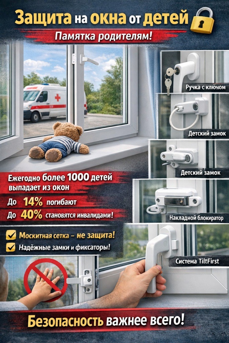 ! Мы часто слышим: «С нами такого не случится» «Ребёнок под присмотром» А потом — сухая статистика: ❗ Каждый год из окон выпадает более 1000 детей ❗ До 14% — погибают ❗ До 40% — остаются инвалидами на всю жизнь Открытое окно рядом с малышом — реальная смертельная опасность. И, к сожалению, трагедии происходят именно из-за ложного чувства безопасности. ☝️ Что важно знать каждому родителю: ✅ Защита обязательна на ВСЕХ открывающихся створках, независимо от типа и направления открывания. ❌ Москитная сетка — не защита! Она не удержит ребёнка. Это самая частая и самая опасная ошибка. ✅ Только специальные детские замки и системы действительно фиксируют окно и не дают ребёнку его открыть. 🔒 Какие средства защиты существуют: 1️⃣ Съёмные ручки и заглушки 2️⃣ Ручки с ключом 3️⃣ Накладные замки и блокираторы (в т.ч. замки с тросиком) 4️⃣ Врезные замки 5️⃣ TiltFirst (Тилт Ферст) — современная встроенная система с детской ручкой 🚀 TiltFirst — самая надёжная защита на сегодня. Ребёнок физ