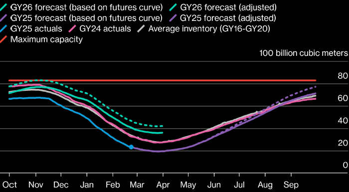 К концу зимнего отопительного сезона хранилища Европы будут заполнены лишь на 24%, что на 9 п.п. ниже исторической нормы, прогнозирует BloombergNEF. В результате, предстоящим летом европейцам придётся резко увеличить закачку газа в хранилища, чтобы к концу сентября довести их заполненность до искомых 86%. Серым — средний уровень заполненности газовых хранилищ Европы в 2016–2020 газовые годы (газовый год — 12-месячный период времени, начинающийся 1 октября), красным — максимально возможный показатель, остальные цветные линии — исторические данные (2024 и 2025 газовые годы), а также прогнозы (2025 и 2026 газовые годы). Источник: BloombergNEF Запасы природного газа в хранилищах так называемого «Европейского периметра»* продолжают оставаться существенно ниже среднего пятилетнего значения, пишут аналитики BloombergNEF. По их оценкам, к концу зимнего отопительного сезона хранилища региона будут заполнены лишь на 24%: это на 9 п.п. ниже исторической нормы. *ProFinance.ru: Северо-Западная Евро