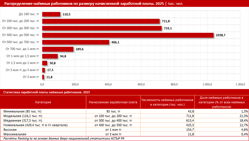Бюро национальной статистики расширило линейку дифференциации заработных плат в Казахстане. Теперь данные ведомства позволяют определять не только «миллионеров», но и тех наемных работников, которые получают более 3 млн тенге в месяц. Судя по отчету за 2025 год, их численность в стране составляла 11,8 тыс. человек. На долю казахстанцев с такой хорошей зарплатой пришлось 0,4% от общей численности наемных работников, пишет ranking.kz. Шкала распределения сотрудников по уровню заработной платы показывает, что наибольшую группу — более 1 млн человек — составляли граждане с зарплатой от 300 тыс. до 500 тыс. тенге. Второе место по численности занимали казахстанцы, зарабатывающие от 200 тыс. до 300 тыс. тенге: 724,1 тыс. человек. Почти столько же насчитывалось работников с зарплатой от 100 тыс. до 200 тыс. тенге: 711,8 тыс. человек. Эти три категории формировали основную массу трудящихся, чьи заработные платы укладываются в «средний класс». БНС регулярно публикует информацию о нескольких расс