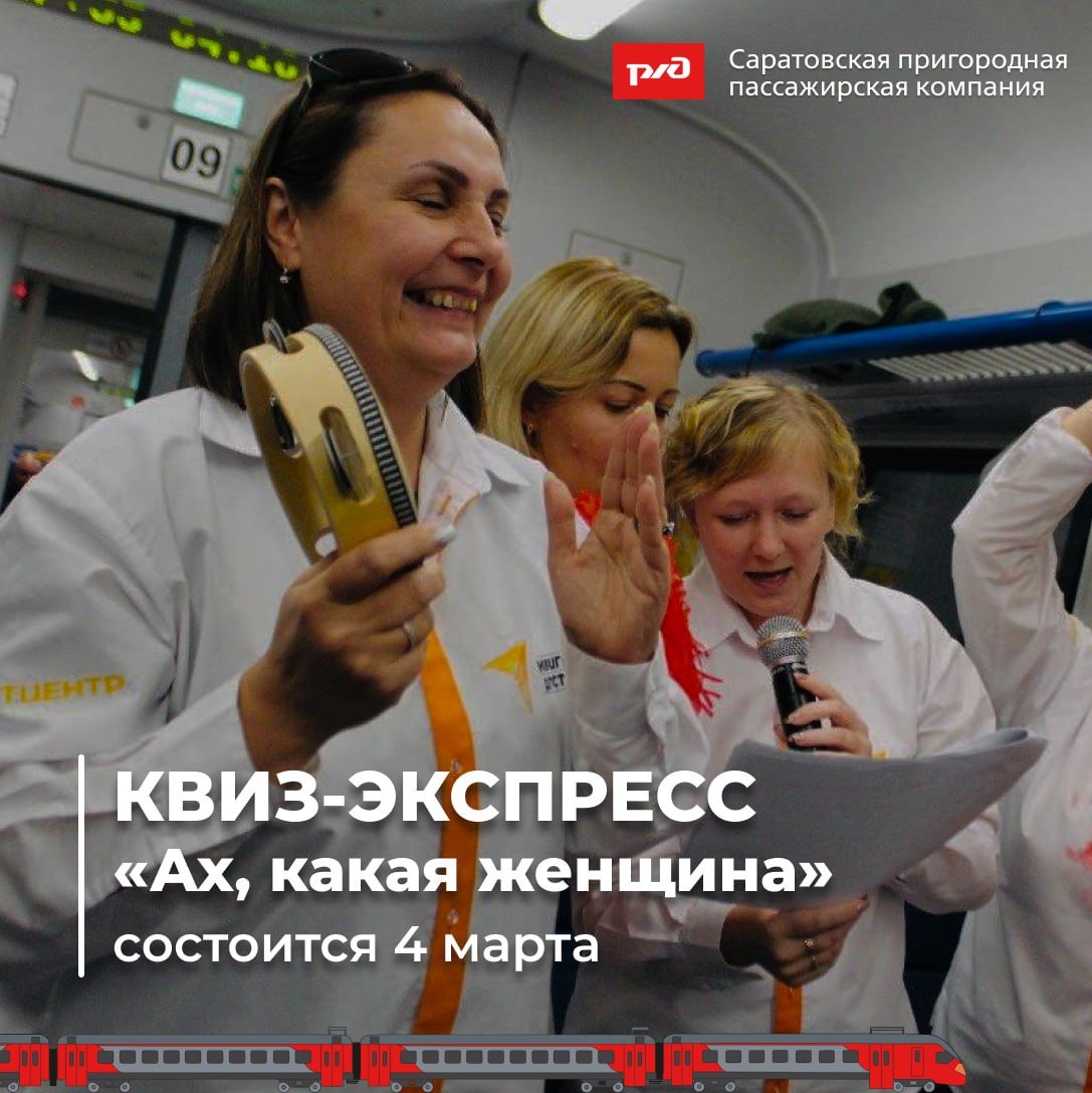 !😍💐 Самый долгожданный квиз от Саратовской электрички и модельной библиотеки № 9 и весеннее, романтичное, яркое настроение отправляется в путь 4 марта 2026 года, в преддверии празднования Международного женского дня. 💯 Участие в квизе - это отличный способ провести время с семьёй или друзьями, размять мозги и получить новые позитивные эмоции! Каждая команда-участник будет награждена памятным сертификатом, а победители – дипломами и памятными призами от АО «Саратовская ППК». 🚆 Со станции Саратов-1 пригородный поезд № 6003 отправится в 09:12 и вернётся на саратовский вокзал в 12:02. ▶️ Стоимость участия в квизе «Квиз-экспресс»: взрослые - 252 рубля, школьники и студенты (при предъявлении ЛТК) - 126 рублей, дети до 7 лет - бесплатно. Количество участников в команде – до 6 человек. 🎶 Наш экспресс ждет только Вас! Встретим весну ярко и музыкально! *** Бронирование пн.-пт. С 8:00 до 17:00 по телефонам: 89271380044 – Анастасия, 89279198082 – Светлана, 89271677525 - Алина.