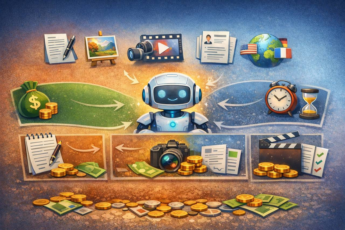 Еще год назад я платил за пять разных сервисов: копирайтинг, генерацию картинок, монтаж видео, конструктор резюме и онлайн-переводчик. Все это было нужно для работы и личных проектов — я веду блог, делаю короткие видео и периодически обновляю портфолио. В какой-то момент я решил проверить, смогу ли заменить все это одним ИИ-инструментом. Эксперимент длился три месяца — и вот какие цифры получились. Первое — тексты. Раньше я заказывал статьи у копирайтера: 2 500–4 000 ₽ за материал объемом 8–10 тысяч знаков. В месяц выходило в среднем 3 статьи — около 9 000 ₽. Плюс подписка на сервис проверки орфографии — 799 ₽. Сейчас черновик статьи я получаю за 5–10 минут, дорабатываю сам за 20–30 минут. Итог: экономия примерно 9 800 ₽ в месяц и около 6–8 часов времени. Второе — картинки. Для блога и обложек видео я пользовался графическим редактором (1 200 ₽ в месяц) и иногда покупал изображения на стоках — еще около 2 000 ₽ ежемесячно. Теперь иллюстрации генерирую через ИИ по описанию. Да, иногда н
