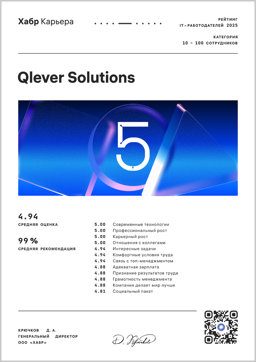 Компания Qlever Solutions заняла 5 место в рейтинге «Лучшие ИТ-работодатели России» и получила высокие результаты в номинациях: Команда Qlever Solutions — это фундамент роста и ключ к устойчивому развитию компании, поэтому особенно ценно видеть высокую оценку условий труда со стороны наших специалистов. Мы стараемся уделять особое внимание корпоративной среде и HR-бренду, создавая пространство, в котором можно раскрывать профессиональный потенциал, реализовывать карьерные амбиции и вместе разрабатывать ИТ-решения, действительно значимые для бизнеса. Дмитрий Киселев
