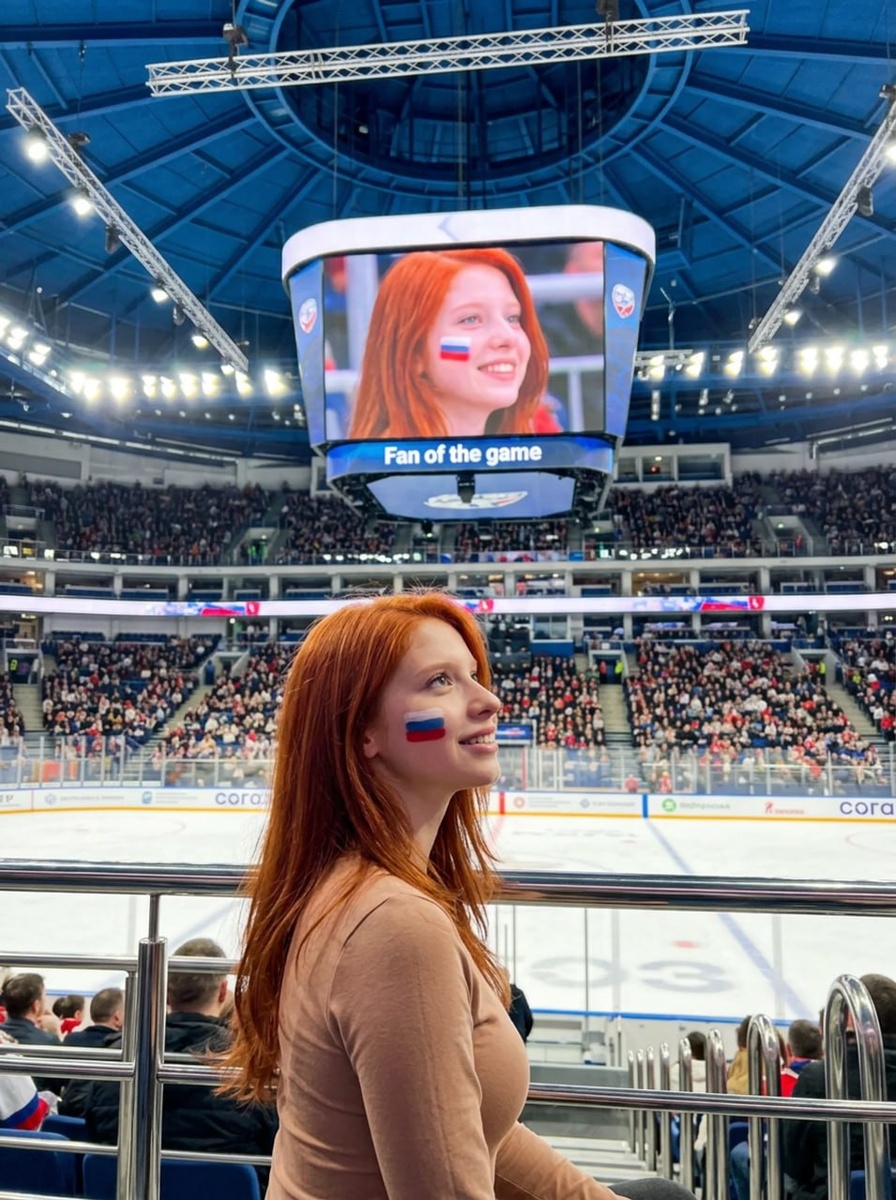 ? 🏒 Вертикальное любительское фото 2:3, снятое на камеру смартфона с трибуны большого крытого хоккейного стадиона. В нижней части кадра на переднем плане сидит девушка, показана по линию талии. Она немного развёрнута корпусом влево, лицо в профиль‑три четверти, подбородок чуть приподнят, взгляд устремлён вверх на центральный экран. Лёгкая улыбка, естественные черты лица, гладкая светлая кожа, на щеке аккуратный фейс‑арт в виде трёхцветного флажка,российского триколора. Макияж повседневный: подчёркнутые глаза, аккуратные брови, мягкий естественный оттенок губ. Волосы распущенные, ровно уложены и свободно лежат на плечах и спине. На девушке простой обтягивающий лонгслив без принтов, за спиной металлические перила ограждения сектора. За её спиной видна ледовая площадка с бортиками без читаемых логотипов и текстов, слегка размытая от глубины резкости. Дальше — плотно заполненные трибуны с толпой болельщиков. В верхней части кадра доминирует крупный подвесной центральный экран под куполом