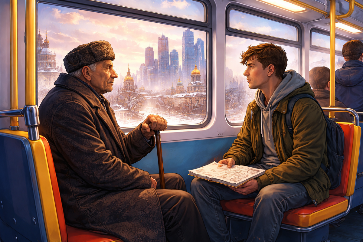 Старик занял место у окна первым. Звали его Виктор Семёнович Краснов, хотя этого никто в вагоне, разумеется, не знал. Восемьдесят один год, сухой, как вяленая вобла, с руками, похожими на корни старого дерева, и глазами – неожиданно живыми, серыми, с той особенной зоркостью, которая приходит к людям, много повидавшим и разучившимся притворяться, что не замечают очевидного. На нём было пальто – добротное, тёмно-синее, советского ещё кроя, но ухоженное, явно берегомое. Шапка-пирожок из каракуля. Трость с потёртым набалдашником стояла между ног, удерживаемая правой ладонью.