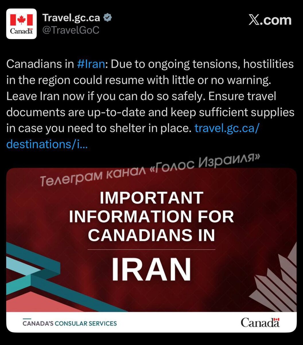 ⚡️Канада призывает своих граждан немедленно покинуть Иран.