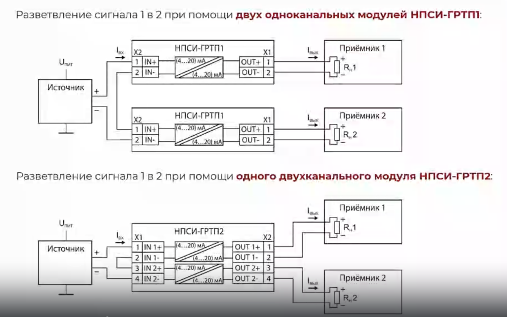На первой схеме показан пример размножения сигнала от одного датчика на два при помощи двух модулей гальванической развязки токовой петли НПСИ-200-ГРТП1.