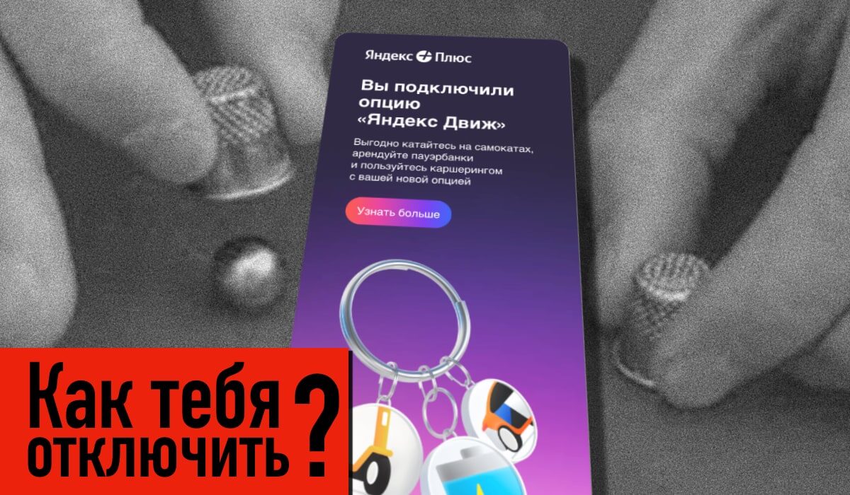 Пришло тут уведомление от Яндекса о новом сервисе «Яндекс Движ». Чисто из любопытства, решил узнать что это вообще такое и, ткнувшись в ссылку, тут же получил подписку на этот самый сервис. Как это часто бывает с подписками, опция отключения оказалась спрятана глубоко внутри, причем совершенного другого приложения. Полагаю, я не один такой любознательный и сейчас расскажу, как же отключить подписку на «Яндекс Движ». Собственно, подписка «Яндекс Движ» это как дополнение к вашей основной подписке «Яндекс Плюс». Без неё работать не будет. «Движ» дает нулевую плату за старт при аренде самокатов. Честно говоря не знаю что это значит, так как сам никогда не пользовался (просьба самокатчикам, отписаться в комментариях для ликвидации безграмотности). Также предоставляется 30 минут «Бери заряд!» каждый день и 10% скидку на каршеринг «Драйв». Естественно, всё это не бесплатно и добавляет к основной подписке «Яндекс Плюс» ещё 199 ₽/мес. Впрочем, вся эта арендная канитель мне и даром не нужна. Та