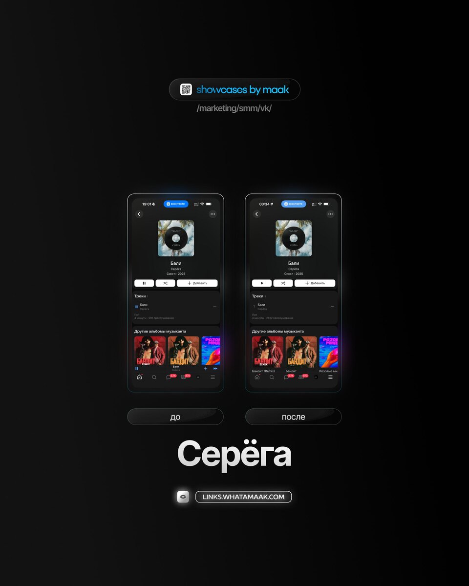 ❤️ Для кого? Серёга 🔼 Что было сделано? • Таргетинг • Посев в музыкальных плейлистах • Посев в музыкальных сообществах 🛒 Заказать 🔍 Другие услуги ℹ️ #вк #vk 🔗 maak® × подробнее • ⚡️ boost