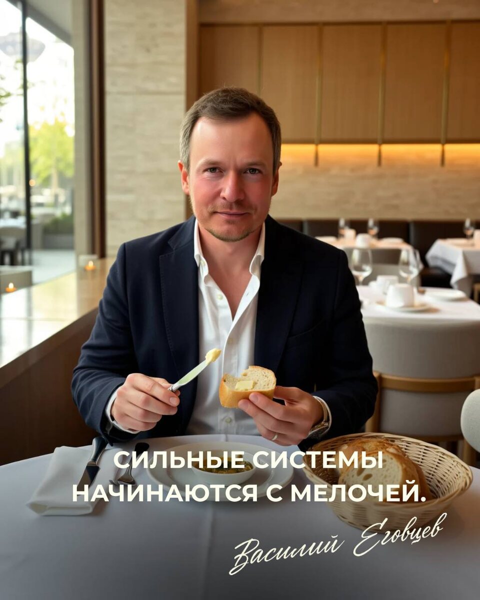 ? Я раньше думал, что хлебная корзина это что-то из серии «ну, пусть будет». А потом узнал один факт. 40 лет назад в США провели социологический опрос. Знаете, по чему люди больше всего запоминают ресторан? Не по кухне, интерьеру и даже не по сервису. А по хлебу и туалету. Хлебная корзина — это не просто хлеб, это про контроль эмоций клиента. Во-первых, это доппродажа. Инвестор внутри вас должен улыбнуться. Во-вторых, и это главное, она спасает ресторан от косяков по времени. Голодный человек — злой человек. Голодная семья — вообще опасно. Но если ты вынес красивую хлебную тарелку, не две замороженные булки, а фокаччу, кростини, и, не дай бог, солёное масло… И уже никого не волнует, принесли салат через 12 минут или через 15. Потому что эмоция накормлена первой. Так что хлебная тарелка это инструмент управления ожиданиями. Как и в бизнесе. Как и в инвестициях. Сначала дай человеку ощущение спокойствия. А потом всё остальное. Именно поэтому сильные системы начинаются с п