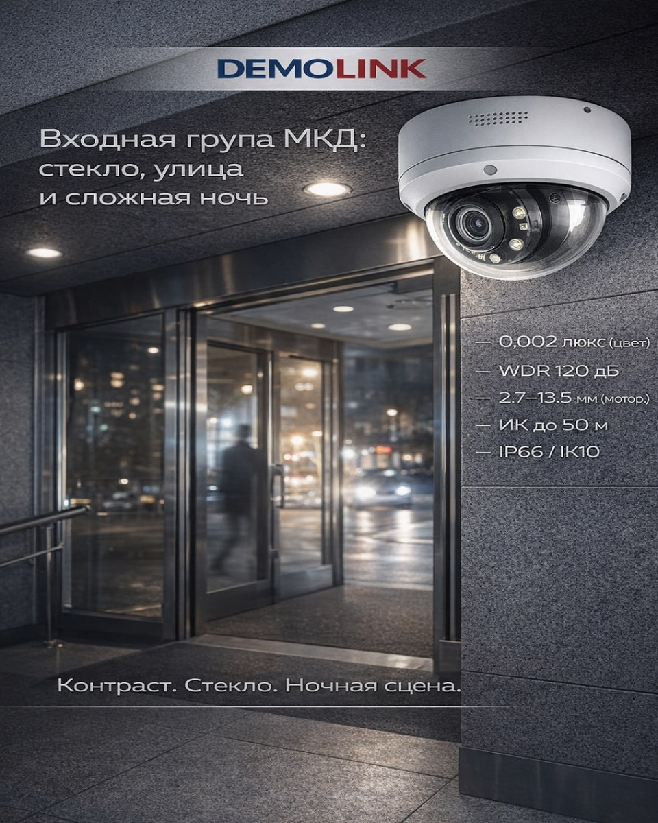 Входная группа — одна из самых сложных зон в многоквартирном доме. В одном кадре одновременно: улица и помещение 🌆 стеклянные двери фонари и фары автомобилей 🚗 движение людей в обе стороны 👣 И при этом важно не просто видеть человека — важно фиксировать его лицо у входа. DC55VC·Ultra уверенно чувствует себя в таких условиях. Высокая светочувствительность — 0,002 люкс в цвете — позволяет сохранять цвет даже при слабом освещении 🌙 WDR 120 дБ помогает удерживать детали, когда за человеком яркая улица или отражение в стекле. Моторизованный объектив 2,7–13,5 мм позволяет точно настроить плотность кадра под входную точку — без лишнего «расширения» пространства. ИК-подсветка до 50 м обеспечивает стабильную работу ночью, а защищённый корпус IP66 / IK10 позволяет устанавливать камеру снаружи без потери надёжности. Почему это решение уместно именно здесь? Потому что камера удерживает детали при контровом свете. Стабильно работает в сложной ночной сцене 🌃 И предсказуемо ведёт себя в