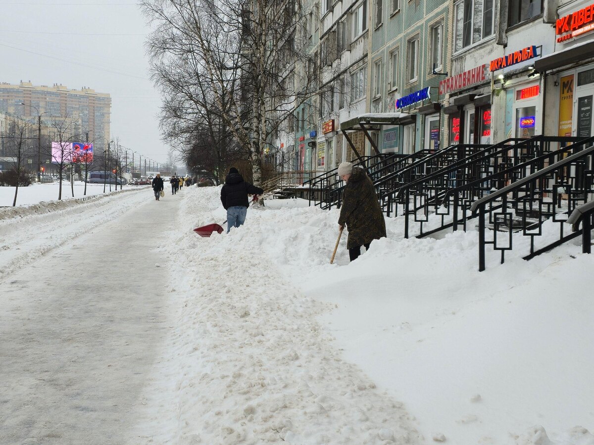 Видео: в районе «Проспекта Просвещения» в Петербурге продолжают уборку снега