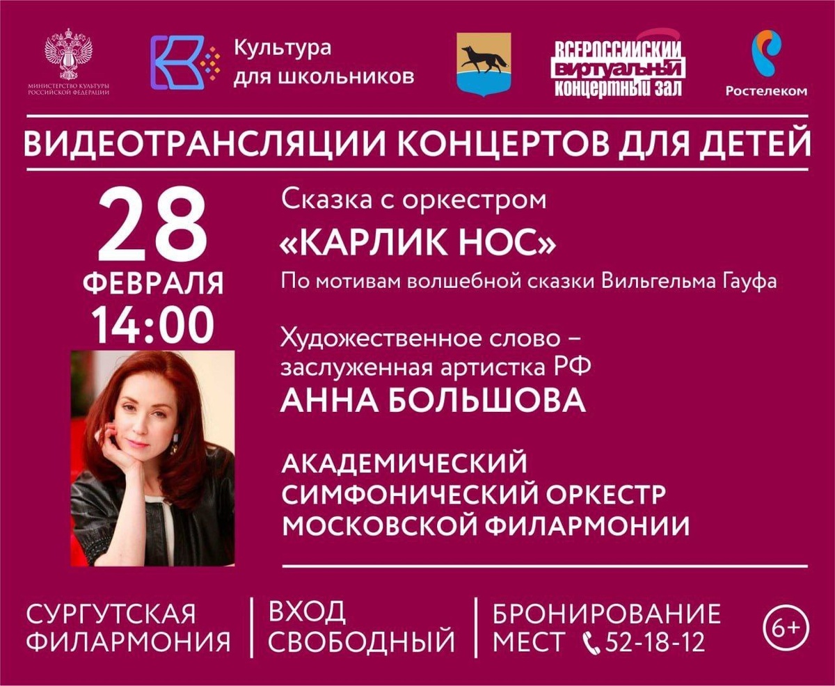 🎈 🎶 28 февраля в 14:00 Сургутская филармония приглашает на видеотрансляцию сказки с оркестром «Карлик нос». Сказка по мотивам волшебной сказки Вильгельма Гауфа готовит встречу с мальчиком Якобом, со страшной старухой-колдуньей, превратившей его в уродливого Карлика Носа, с гусыней Мими, злым герцогом и другими необычными героями. Музыка – Л. Бетховен, Л. Шпор, Ф. Мендельсон, Р. Вагнер, И. Брамс, Г. Малер, И. Стравинский. Академический симфонический оркестр Московской филармонии. Дирижер – лауреат всероссийских и международных конкурсов Димитрис Ботинис. Художественное слово – заслуженная артистка Российской Федерации Анна Большова. Вход свободный. По вопросам наличия мест и возможности бронирования уточняйте по тел.: 52-18-12. 🎶 28 февраля в 18:00 в Сургутской филармонии состоится премьера концертной программы «Русская классика» в исполнении Симфонического оркестра Сургутской филармонии и хоровой капеллы «Светилен». В программе Четвертая симфония Сергея Танеева, кантата «Москв