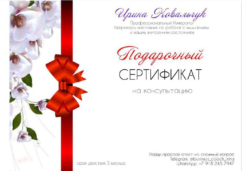 🎁 Уже совсем скоро 8 марта 🌷 Если вы не знаете, что подарить маме, дочери, подруге, коллеге - подарите полезный подарок 💌 Подарочный сертификат на нумерологическую консультацию или трансформационную сессию В прошлом году мужчины дарили на корпоративе в компании своим прекрасным коллегам такие сертификаты. Для некоторых был первый опыт, но всем понравилось 😊 В этом году- тренд повторился. И это радует Сертификаты потом можно использовать в течении трёх месяцев в удобное время 👌 Радуйте своих близких 💝