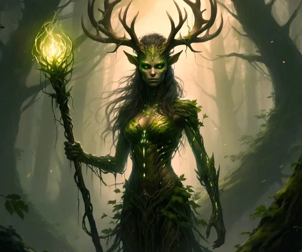 Дриада. Сердце Зелени Дриады-смертные существа, олицетворяющие дух леса, часто связанные с дубами. В тех краях, где деревья старше памяти людей, а туман по утрам стелется так низко, что кажется это сами корни дышат, ходит древняя легенда. О дриаде, связанной с вековым дубом у Чёрного ручья. Говорят, она не просто дух леса — она его гнев, его память, его приговор тем, кто осмелится нарушить священный покой. Туман стелился по земле, словно живое существо — липкий, холодный, пробирающий до костей. Он поглощал звуки, искажал очертания деревьев, превращая их в сгорбленных чудовищ. Лишь одно выделялось в этой серой пелене — она. Дриада стояла на небольшой поляне, окружённой древними дубами. Её кожа, напоминающая кору старого дерева, была испещрена глубокими трещинами, из которых сочилась вязкая янтарная смола. Длинные ветвистые рога, покрытые молодыми побегами и колючими шипами, венчали голову, словно корона из ночных кошмаров. В руках она сжимала посох, обвитый живыми лозами, которые шевели