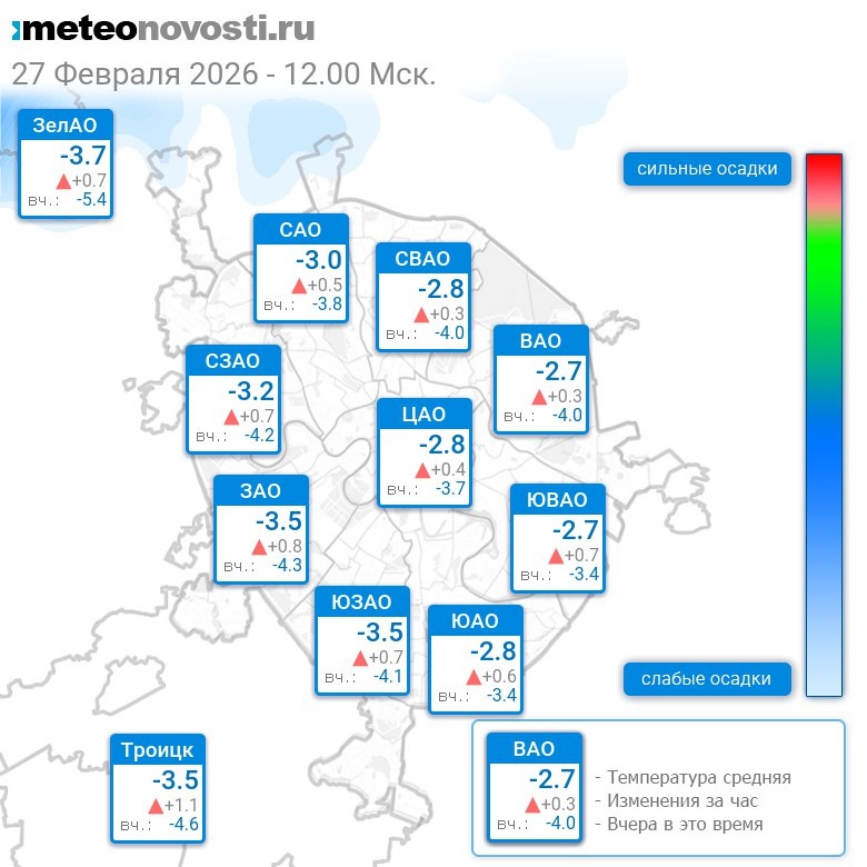 В 12:00 в Москве было от -4.4°C до -1.6°C, средняя температура -3°C #погода #Москва #зима #температура #27февраля #пятница