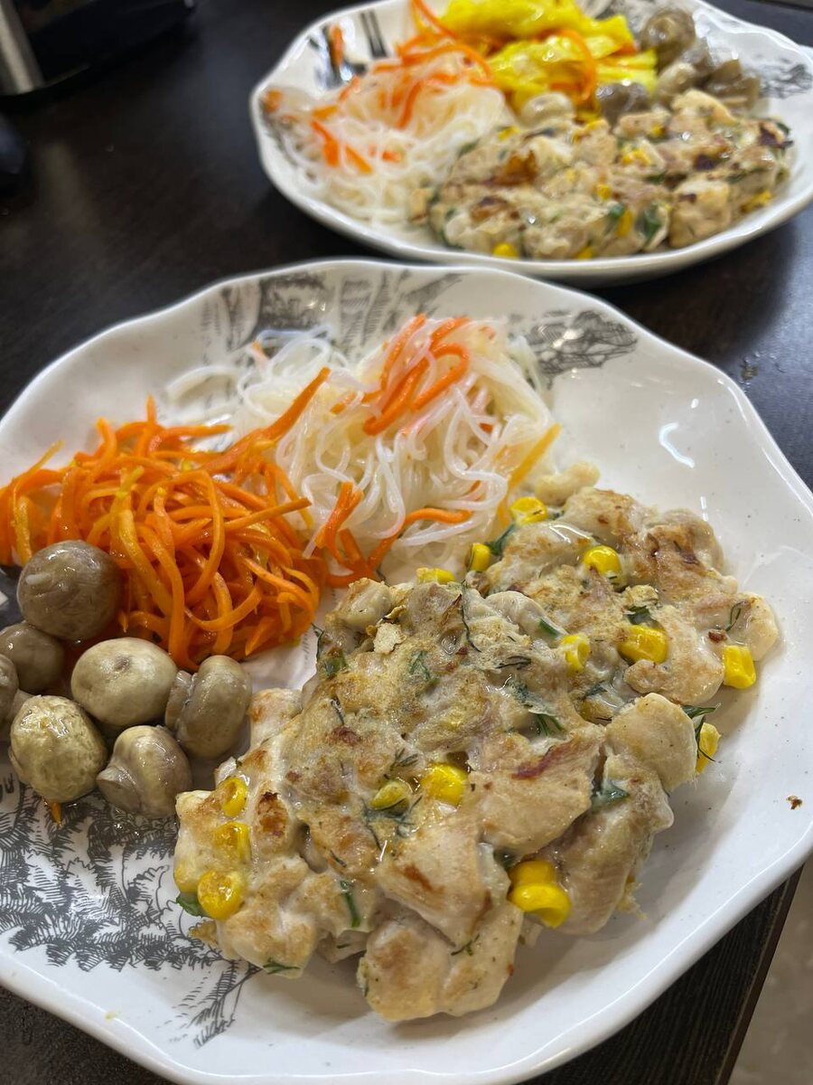 Обожаю курицу во всех её проявлениях, особенно куриные рубленые котлеты с зеленушкой и кукурузкой. Ингредиенты: • куриные бёдрышки — 1 упаковка • кукуруза — 100 г • зелень — любая по вкусу (у меня укроп и зелёный лук) • яйцо — 1 шт. • мука — 2 ст. л. • соль • масло — немного для жарки Как готовить: • Куриные бёдрышки нарезаем квадратиками. Можно пробить в блендере, но не превращать в кашу, чтобы текстура оставалась кусочками. Я в этот раз резала ножом, как салаты на Новый год🤣 • Добавляем кукурузу, яйцо, зелень, соль и муку. • Всё хорошо перемешиваем. • Сковородку слегка смазываем маслом, так образуется красивая румяная корочка. • Выкладываем массу ложкой на сковороду. • Накрываем крышкой, готовим, затем переворачиваем. • Если какие-то кусочки отломятся — ничего страшного, на вкус это никак не влияет. Мы с мужем съели почти всё сразу — я еле успела отложить пару котлет ему на обед с собой 🙂 Приятного аппетита ❤️ КБЖУ на 100 г: 183 ккал • Б 16.2 г • Ж 11.2 г • У 4.1 г 🍝🍝🍝