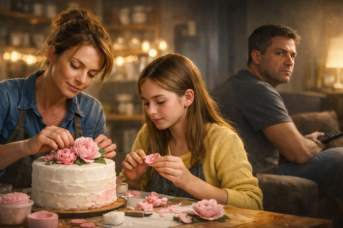 Алиса пришла в кафе сразу после школы, и они вместе колдовали над тортом. Дочь лепила цветы — розовые пионы, нежные, почти живые. Лена собирала коржи, промазывала кремом, выравнивала поверхность.