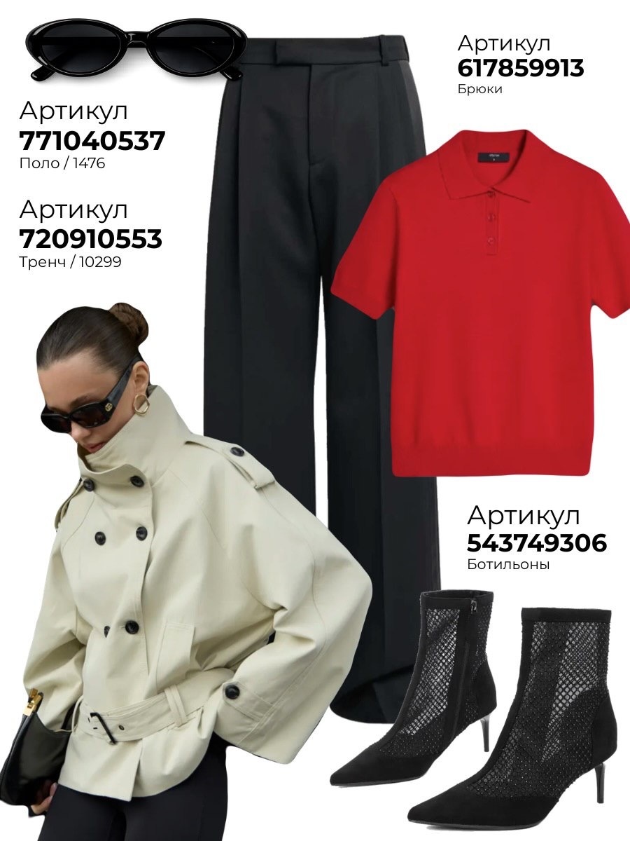 Этот набор — отличный пример того, как из четырёх позиций собрать весенний образ, который выглядит собранно, но не скучно. Светлый тренч даёт свежесть, чёрные брюки держат форму, ботильоны добавляют характер, а очки ставят финальную точку.