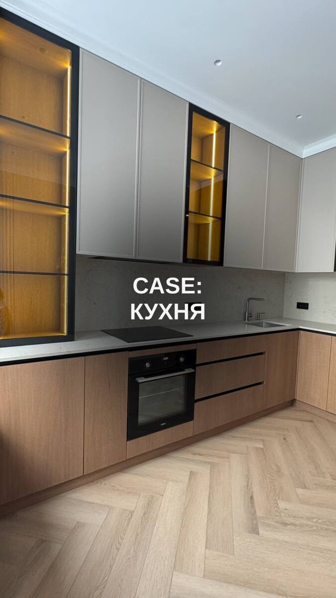 Нижние фасады из тщательно подобранного шпона создают ощущение естественного уюта и плотного, монолитного объёма, верхние — с изящной тонкой фрезеровкой — добавляют ритм, глубину и деликатную текстуру. Тонкая столешница светлого оттенка подчёркивает чистоту линий и визуально облегчает композицию, а стеклянные вставки с чёрным профилем привносят прозрачность и современную архитектурную ноту. Эта кухня — о тактильной гармонии, визуальной лёгкости и премиальной эстетике без лишнего декора, где каждая деталь служит функциональности и красоте.