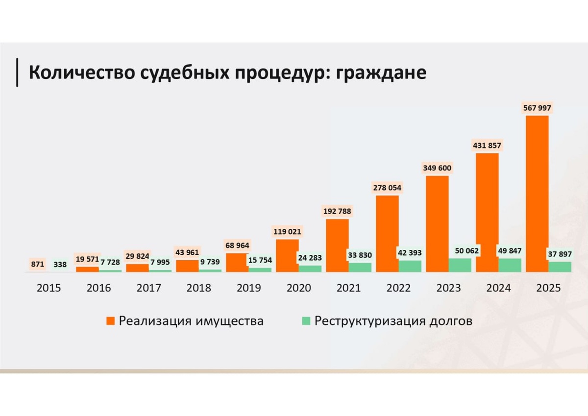 Мы собрали статистику прошлого года. Не для отчёта, а чтобы снять самые частые страхи. 🔸 Боитесь, что «заберут всё»? В 94% дел, которые дошли до суда, у людей не оказалось имущества для продажи. Ни квартир, ни машин, ни счетов. Процедура прошла без потерь. У остальных — продавали только то, что действительно можно было реализовать по закону. 🔸 Боитесь, что не спишут? В 98,8% случаев долги списали полностью. Не освободили от обязательств — только 1,2%. Это статистика, а не обещание. Но шансы явно не «один на миллион». 🔸 Боитесь, что затянется? В среднем процедура длится 297 дней. Около 10 месяцев. Да, быстро не получится. Но и не годы. 🔸 Думаете, вы один такой? В 2025 году суды запустили 568 тысяч процедур. Это на 30% больше, чем годом раньше. Банкротство давно перестало быть чем-то исключительным. 🔸 Внесудебное тоже работает. Ещё 68 тысяч человек списали долги через МФЦ — вообще без суда. Эти цифры не про то, что банкротство — лёгкий путь. Они про то, что это понятный,
