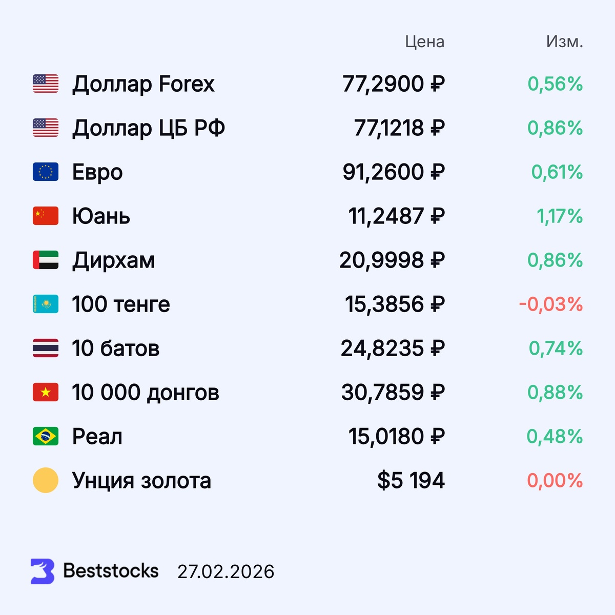 #валюта #курс #доллар #евро #юань #дирхам #тенге #золото ••••• ❓ Брокер перестал показывать стоимость портфеля? Это можно исправить — BestStocks сделал специальный бесплатный инструмент, который показывает стоимость всех акций в вашем портфеле в реальном времени. Попробовать бесплатно