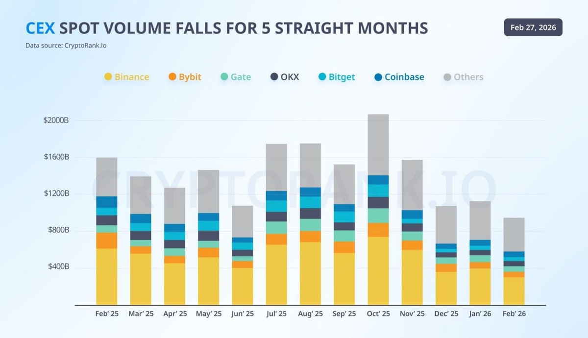 🔸Объём спотовой торговли на CEX падает пять месяцев подряд