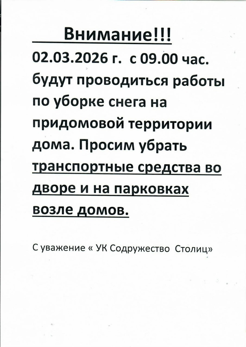 Внимание! 02.03.2026 будет производиться уборка снега на территории домов: Центральная, 50/1, 52/2, 52/3, 54/2. Просьба убрать припаркованный транспорт.