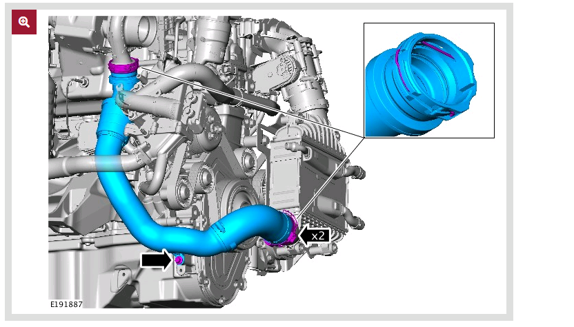 В соединении впускного трубопровода охладителя наддувочного воздуха / турбокомпрессора могут присутствовать остатки масла. Надежность соединения хуже ожидаемой. Снимите впускной трубопровод охладителя наддувочного воздуха. Удалите остатки масла, обнаруженные на конце впускного трубопровода охладителя наддувочного воздуха, соединенного с турбокомпрессором и выходом турбокомпрессора, как показано на рисунке. Установите уплотнительное кольцо на конец впускного трубопровода охладителя наддувочного воздуха, соединенного с турбокомпрессором, как показано на рисунке.