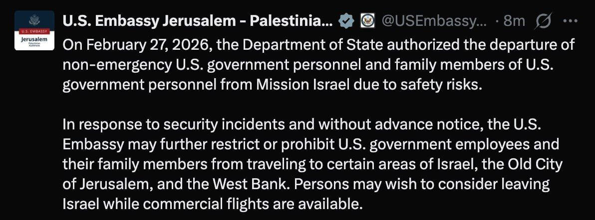Госдеп разрешил второстепенному персоналу госслужащих и членам их семей покинуть Израиль из-за угроз безопасности, сообщает посольство США в