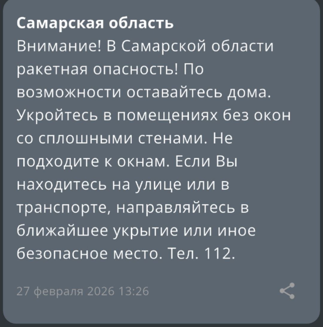 Днем 27 февраля жителям Самарской области пришло экстренное предупреждение. В регионе впервые объявили об опасности ракетного удара. Сигнал поступил в приложение МЧС в 13:26 по местному времени. Спасатели просят всех соблюдать спокойствие и правила безопасности. Людям советуют не выходить на улицу без необходимости. Если вы дома — нужно уйти в комнату без окон или в коридор. Тем, кто оказался на улице или в дороге, следует немедленно найти укрытие. Горожане продолжают получать сигналы тревоги в Промышленном, Красноглинском и Октябрьском районах. Сирены работают в штатном режиме, тревога не учебная. В Самарской области объявлен план «Ковер». Воздушное пространство временно закрыто. Фото: Скриншот/МЧС Самарской области