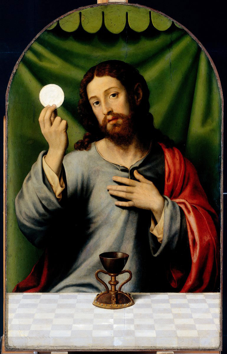 Эта расписная деревянная панель когда-то была дверью Табернакля. На оборотной стороне изображена христограмма IHS, латинская транскрипция греческого имени Иисуса, а на лицевой — сам Спаситель, держащий Святые Дары, в жесте, отсылающем к первоначальной функции картины. Работа особенно интересна тем, что изображенная на ней чаша — это реальный предмет, хранящийся в Валенсийском соборе. Согласно легенде, это не что иное, как сам Святой Грааль, из которого Иисус пил во время Тайной вечери. Исследования показали, что чаша, напоминающая средневековое произведение искусства, на самом деле состоит из двух частей: агатовой чаши, датируемой дохристианскими временами, и золотого основания и ручек, которые были добавлены позже.
