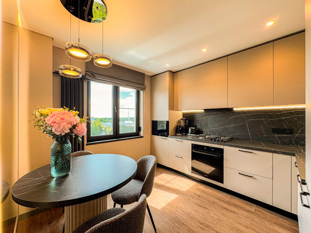 - Задачи: сделать функциональную стильную кухню, визуально увеличить площадь помещения, создать пространство, в котором приятно находиться