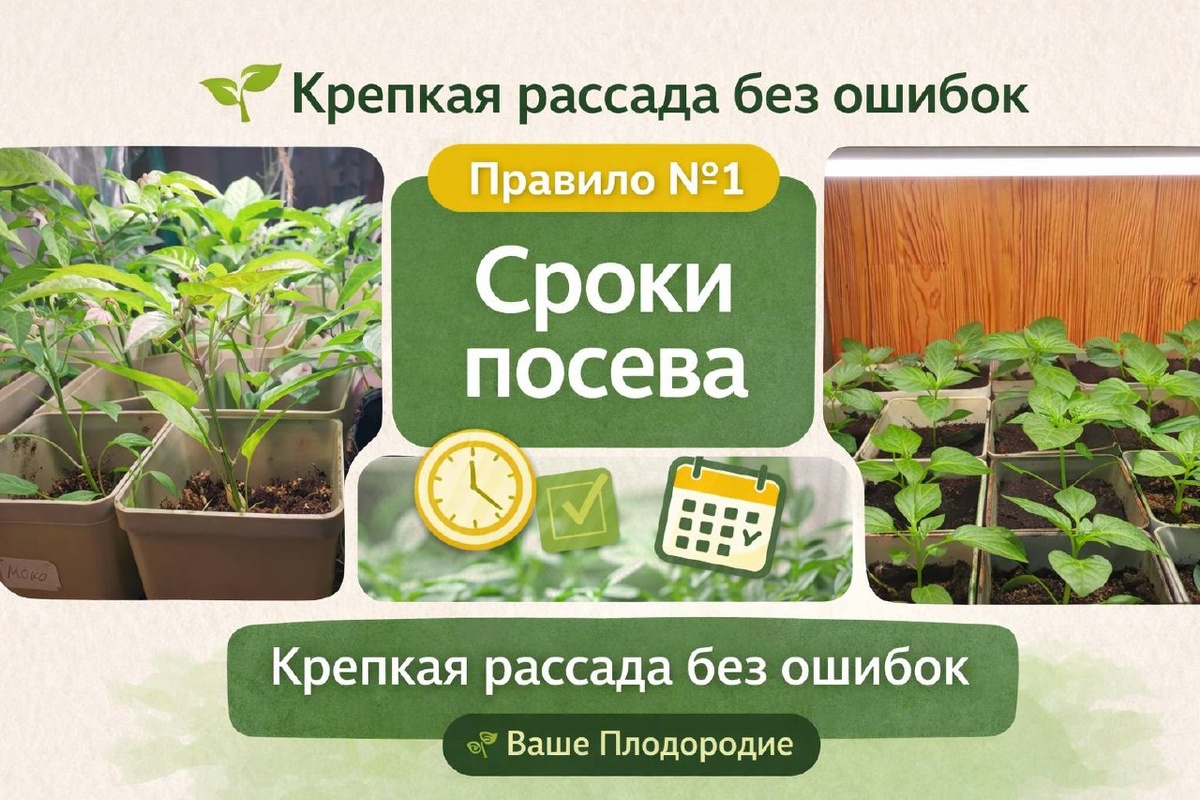 ПРАВИЛО №1 — сроки посева 🪴👍⬇️ Серия постов о том, как вырастить крепкую, здоровую рассаду, а значит — заложить основу будущего урожая 🌱 Каждый пост — одно важное правило. ➡️ Сегодня — самое первое и ключевое 👇 ✳️ Правило #️⃣1️⃣. Сроки посева решают всё Очень хочется посеять пораньше — руки так и тянутся к семенам 🤭 Но ранний посев не приближает урожай, а часто приводит к: ▪ вытягиванию рассады ▪ слабым стеблям ▪ сложной адаптации после высадки Чтобы рассада была крепкой, важно сеять не рано, а вовремя. 🪴 Как правильно рассчитать дату посева: 1. Определяем примерную дату высадки в грунт 2. Отсчитываем назад: - оптимальный возраст рассады - время на прорастание семян ➡️ Получаем идеальный срок посева 🌱 🧾 Оптимальный возраст рассады ✔️ Томаты — 50–60 дней ✔️ Перцы и баклажаны — 60–70 дней ✔️ Огурцы, арбузы, дыни — 20–30 дней ✔️ Капуста — около 45 дней 📅 Примерные сроки посева семян 🍅 Томаты • теплица — февраль–середина марта • открытый грунт — март–апрель 🫑 Перцы и бак