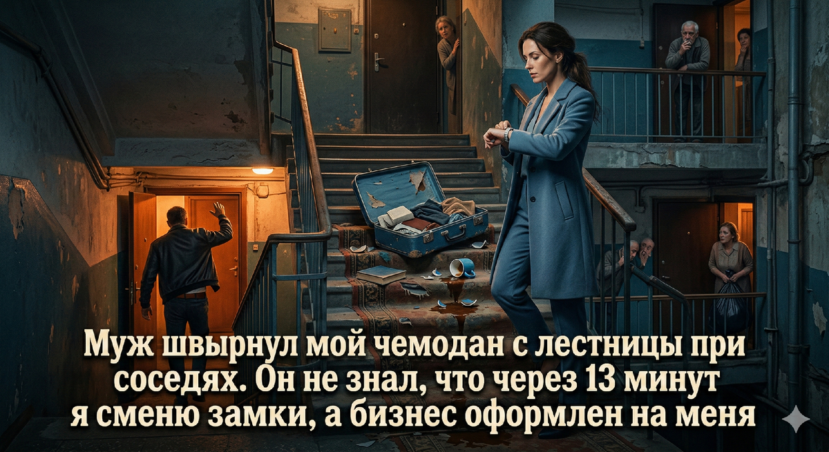 Я осталась стоять в подъезде. Один размазанный чемодан, мокрое пальто и семь свидетелей, которые теперь точно будут знать: Марина из сорок пятой — неудачница, которую муж выставил на улицу как надоевшую собаку.