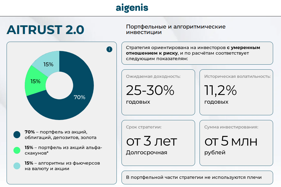Мы в Family Office ABTRUST продолжаем расширять наше партнерство. Поскольку к нам приходят письма с желанием присоединится к одной из стратегий, но далеко не у всех есть возможность сразу стать нашим VIP клиентом (20+ млн), мы создаем различные коллаборации с профучастниками рынка. Такие взаимовыгодные сотрудничества позволяют нам прежде всего пользоваться инфраструктурой, лицензией, фронт и бэк офисом партнеров, не наращивая свои собственные издержки. А партнерам ставить на полку достойные продукты. В прошло году мы начали интеграцию с одной из активно растущей инвестиционной компанией АЙГЕНИС (100% дочка крупнейшего белорусского небанковского брокера). После различных согласований и тестов FO ABTRUST и Айгенис готовы представить флагманскую стратегию AITRUST 2.0 в форме индивидуального доверительного управления. ✅ Входной порог в неё в 4 раза ниже, чем в VIP и составляет всего 5 млн. рублей. ✅ Комиссия за управления, как у наших клиентов с 20 млн - 1,5% от стоимости чистых активов в