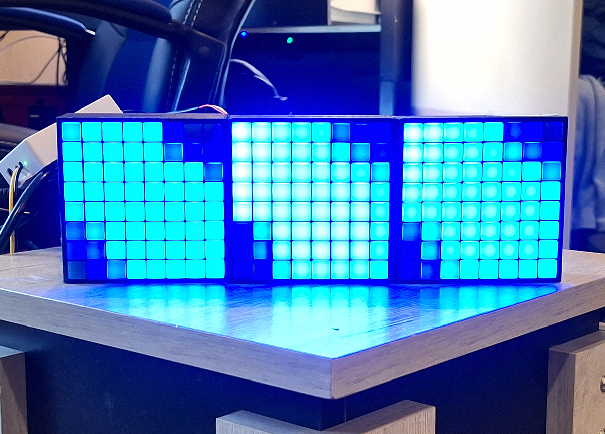 Печатать корпусы было достаточно долго, на фанерном ZAV с прямой подачей, печать одного корпуса занимала более 6 часов, а перепечатывал я их регулярно. Это тормозило процесс, отнимало пластик, и в целом печалило) И вот в таких настроениях, я заказывал матрицы для дополнительных панелей, и обратил внимание на размер диодных матриц 8х8. Я видел их и раньше, но они мелкие, такими стену не заставить, поэтому даже не смотрел на них. Но тут меня посетила гениальная мысль: отработаю производство на маленьком масштабе, а потом просто увеличу до 16х16. Таким образом, я почти в 4 раза уменьшил время печати корпуса и всех остальных элементов, да и в целом матрицы 8х8 оказались очень приятными сами по себе. Да, стену не заставишь, но например, можно собрать настольный светильник, или заставить ими небольшую область, собрать бегущую строку, etc. Фоток сохранилось мало, но вот размерчик:
