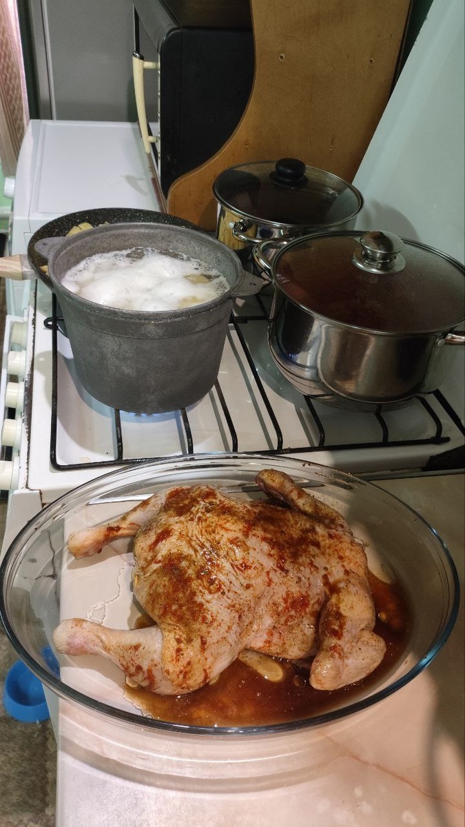🤣. Такое бывает редко, но метко. Наготовила: Борщ. Картошка жареная. Картофельное пюре. Пирог с яблоками, грецкими орехами и корицей( стоит в духовке). Курица будет запекаться ( ждёт своей очереди в духовке) 😁. Компот ассорти: чёрный виноград, яблоки, груши и мандарин. И еще будет салат из свёклы с грецкими орехами и чесноком. У меня иногда случаются кулинарные порывы🤣, и тогда меня не остановить, хочется приготовить все и сразу. Только кто это теперь будет всё есть непонятно 🤔. Володя говорит, ты прямо как для гостей наготовила 😊