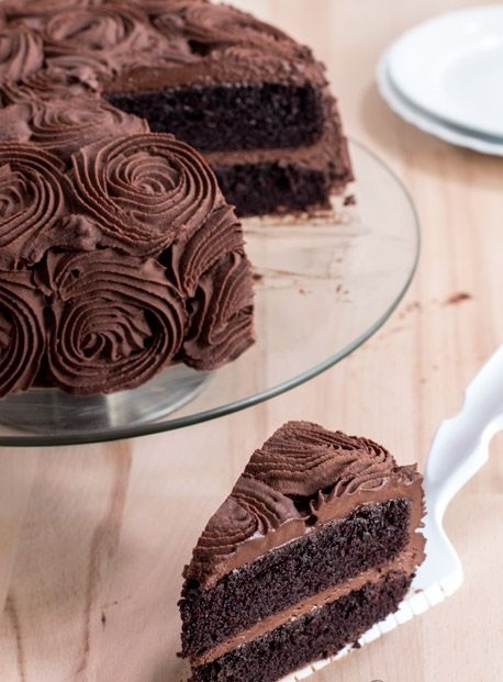 10. Соберите торт. Поместите 1 слой бисквита на блюдо. Распределить равномерно часть шоколадного крема. Добавьте второй слой бисквита. Постепенно добавьте сверху и по бокам торта.
