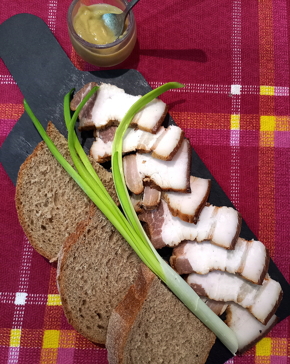 Такое сало – настоящий домашний деликатес. Думаю, придется по вкусу даже тем, кто не любит жирное, особенно, этот, безусловно, полезный продукт. А угостил им меня и, конечно же, поделился рецептом Юрий Петрович, мой старинный друг и большой специалист по приготовлению домашних солений. Непременно на рынке нужно купить свежую, не подвергавшуюся заморозке свиную грудинку с мясной прослойкой и мягкой шкуркой. Пласт сала разделить на кусочки, не прорезая шкуру. Затем сало необходимо замариновать. Для этого Юрий Петрович использует специальный готовый «Рассол для копчения сала». Пузырек такого рассола можно приобрести в тех же рыночных рядах или в отделе специй в супермаркете. Если же не удастся купить такой маринад, его вполне можно приготовить самостоятельно. Достаточно смешать в одной емкости небольшое количество воды с солью, сахаром, сухим чесноком, красным острым и черным молотым перцами, паприкой, готовой горчицей, сырым яйцом. Для придания аромата копчения плеснуть в смесь немного