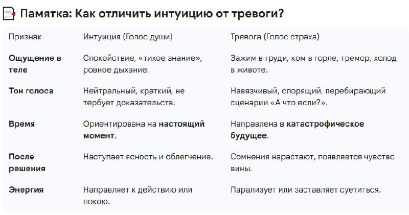 💡 3 вопроса для самопроверки: 1️⃣Если я сейчас физически отдохну и поем, это чувство исчезнет? Да — это усталость и тревога. Нет — стоит прислушаться. 2️⃣Я боюсь последствий или я просто «знаю», как лучше? Боюсь — это тревога. Знаю — это интуиция. 3️⃣ Мое решение сужает мой мир или делает его понятнее? Тревога всегда ограничивает и закрывает нас от мира под предлогом «защиты». ❗️Главный инсайт: Интуиция говорит тебе, что делать. Тревога кричит о том, чего делать НЕЛЬЗЯ. 👇🏻Поделитесь в комментариях умеете ли Вы отличать интуицию от тревоги? #психология #эзотерика #чеклист