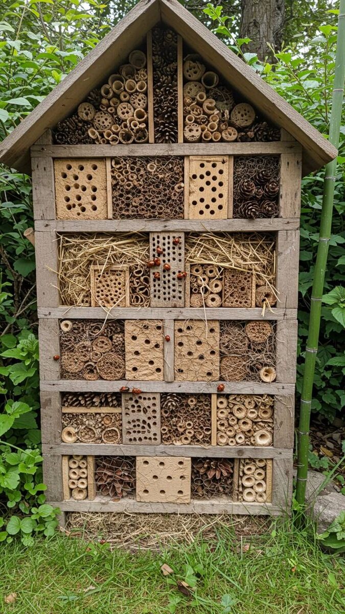 ? Если по-простому: это «мини-общежитие» для полезных насекомых, которые помогают вам бороться с вредителями без химии. Такие домики привлекают божьих коровок, златоглазок, журчалок, мух и ос, паразитирующих на вредителях. В этом исследовании говорят, что при правильной установке тли в саду может стать заметно меньше — иногда до 30%. Важно: это не магия и не гарантия «ноль вредителей». Это помощь природе, чтобы она работала на вас. Что они дают? Божьи коровки, мухи-журчалки, златоглазки и хищные клопы питаются тлей. Трихограмма, мухи-тахины и наездники сдерживают гусениц и других вредителей, откладывая яйца внутрь насекомого и уничтожая изнутри. В маленьких садах (до 5 соток) эффект обычно заметен уже через сезон. Как должен выглядеть нормальный домик? Внутри — разные «комнаты»: — Полые трубочки (бамбук, тростник) — для ос — Щели и кора — для божьих коровок — Глиняные отверстия — для златоглазок — Сухие листья и хвоя — для жужелиц — Высота — примерно 1–2 метра. — Обязательно крыша