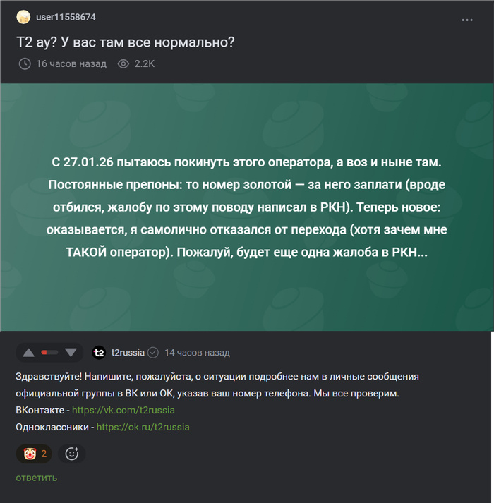 Я с 27.01.2026 пытаюсь от вас уйти. Всю эту бесконечную эпопею я тусуюсь в вашей техподдержке — толку ноль. Заявки заводите — 7 дней рассматриваете, продлеваете. Только по закону переход от оператора к другому оператору длится 8 дней. На 4-й день новый оператор проверяет, нет ли минуса на счете (а он был -15250), — последовал отказ от перехода. Опять обращение, опять 7 дней и по новой чехарда. К концу месяца, видимо, я был более убедителен и настойчив, и долг убрали. Сижу довольный, но недолго))). На 4-й день вновь начатого процесса перехода происходит магическое проявление отказа: выясняется, что я сам «отказался от перехода». Чувствуется, идет подковерная игра: лишь бы я устал от этого процесса и остался у оператора, который с таким подходом и философией мне не нужен даже со скидкой на тариф в 70%. Пройдет 10, 15 лет, и я, уже плохо соображающий, буду думать и не понимать: что там еще выдумал мой оператор, чтобы залезть мне в кошелек? Пост автора user11558674. Читать комментарии на