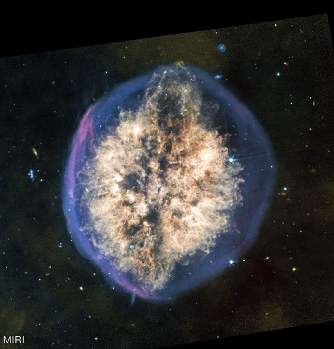 ». Телескоп «Джеймс Уэбб» снял туманность ПМR-1 на расстоянии около 5000 световых лет от Земли. Это облако газа и пыли, оставшееся после гибели звезды. Снаружи — водород, внутри — более тяжёлые элементы, которые звезда выбросила перед концом.